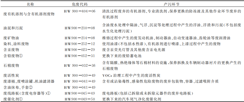 汽車維修過(guò)程產(chǎn)生的固體廢物包括一般工業(yè)固廢、危險(xiǎn)固廢和生活垃圾三類。一般工業(yè)固廢有碎玻璃、廢塑料、廢輪胎、廢鋰電池等,對(duì)照《國(guó)家危險(xiǎn)廢物名錄(2021年版)》,危險(xiǎn)廢物共涉及8類12種(表1),其中廢礦物油、廢鉛蓄電池約占危險(xiǎn)廢物總量的90%。
